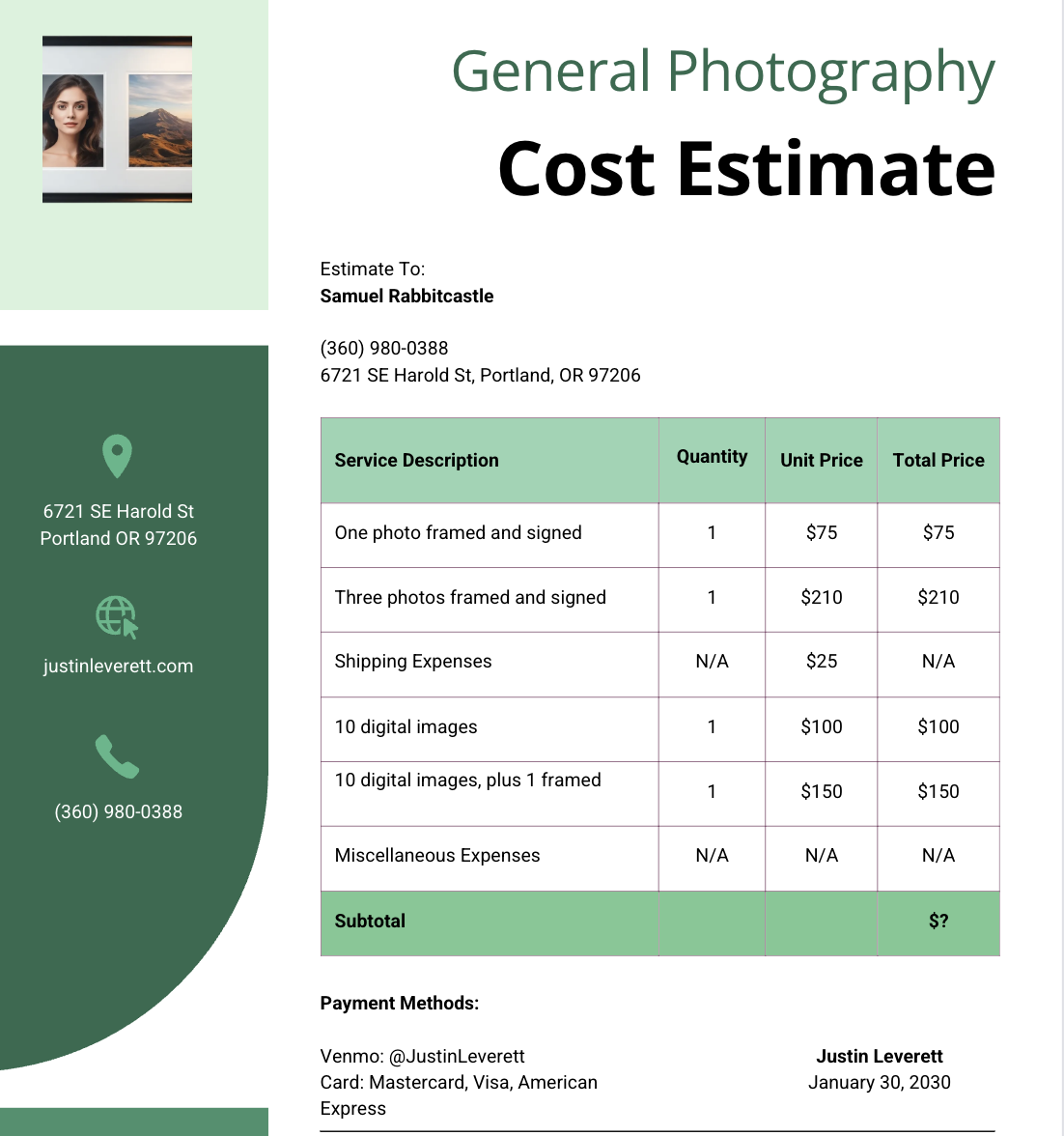 For samples of my work, see below, or visit me at my Instagram handle, @justinlev7.
